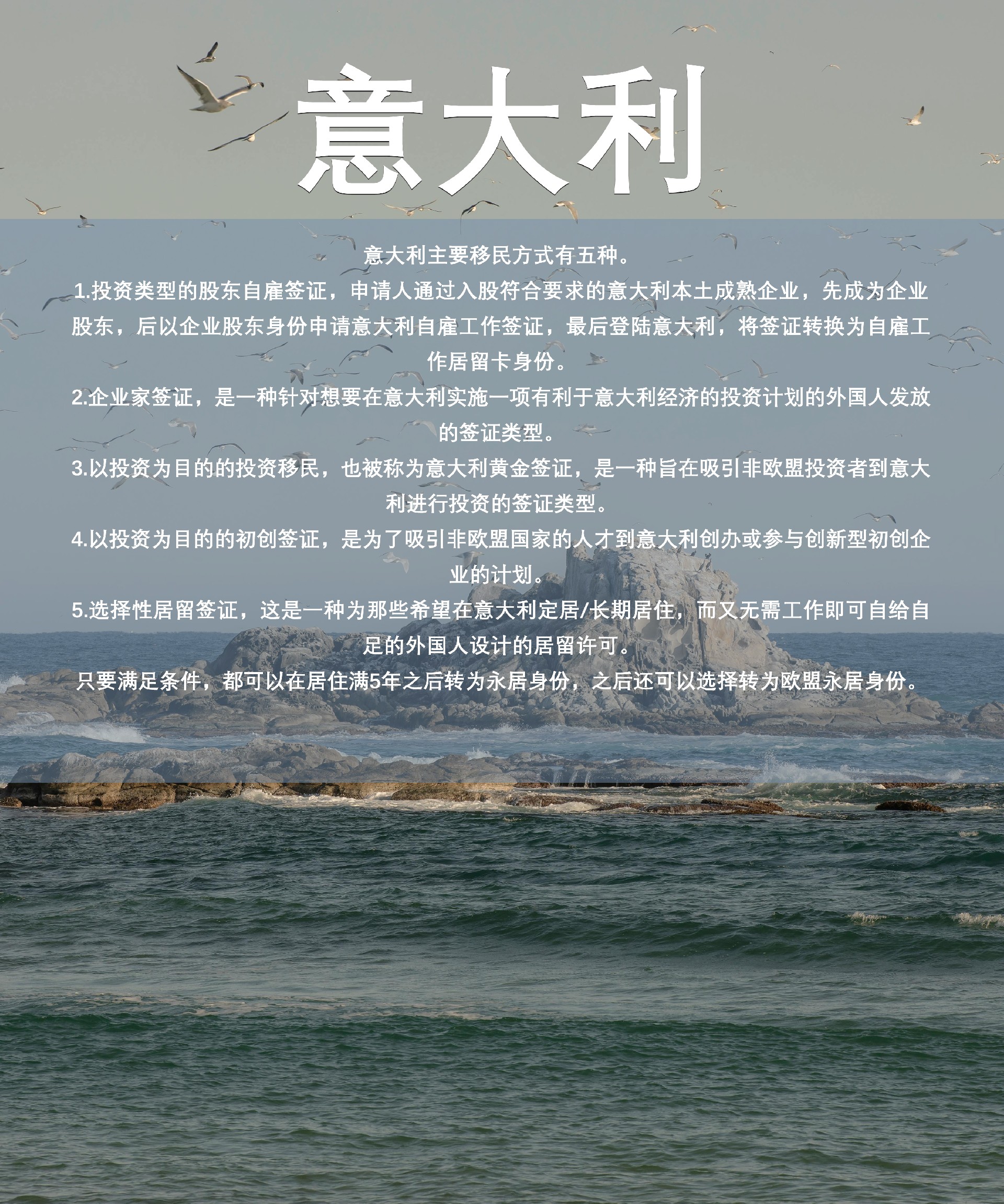 意大利主要移民方式有五种。1.投资类型的股东自雇签证,申请人通过入股符合要求的意大利本土成熟企业,先成为企业股东,后以企业股东身份申请意大利自雇工作签证,最后登陆意大利,将签证转换为自雇工作居留卡身份。2.企业家签证,是一种针对想要在意大利实施一项有利于意大利经济的投资计划的外国人发放的签证类型。3.以投资为目的的投资移民,也被称为意大利黄金签证,是一种旨在吸引非欧盟投资者到意大利进行投资的签证类型。4.以投资为目的的初创签证,是为了吸引非欧盟国家的人才到意大利创办或参与创新型初创企业的计划。5.选择性居留签证,这是一种为那些希望在意大利定居/长期居住,而又无需工作即可自给自足的外国人设计的居留许可。只要满足条件,都可以在居住满5年之后转为永居身份,之后还可以选择转为欧盟永居身份。