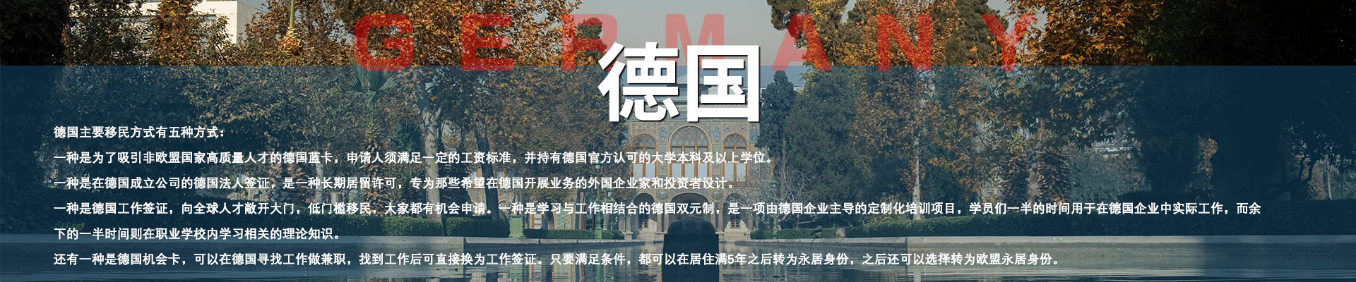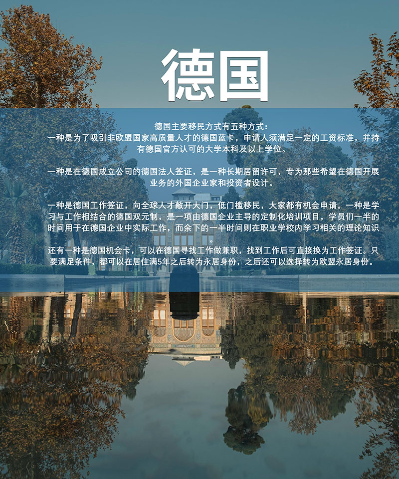德国主要移民方式有五种方式。一种是为了吸引非欧盟国家高质量人才的德国蓝卡,申请人须满足一定的工资标准,并持有德国官方认可的大学本科及以上学位。一种是在德国成立公司的德国法人签证,是一种长期居留许可,专为那些希望在德国开展业务的外国企业家和投资者设计。一种是德国工作签证,该签证向全球人才敞开大门,低门槛移民,大家都有机会申请。一种是学习与工作相结合的德国双元制,是一项由德国企业主导的定制化培训项目,学员们一半的时间用于在德国企业中实际工作,而余下的一半时间则在职业学校内学习相关的理论知识。还有一种是德国机会卡,可以在德国寻找工作做兼职,找到工作后可直接换为工作签证。