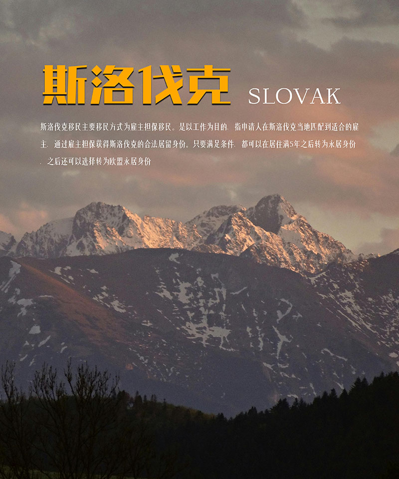 斯洛伐克移民主要移民方式为雇主担保移民。是以工作为目的,指申请人在斯洛伐克当地匹配到适合的雇主,通过雇主担保获得斯洛伐克的合法居留身份。只要满足条件,都可以在居住满5年之后转为永居身份,之后还可以选择转为欧盟永居身份。