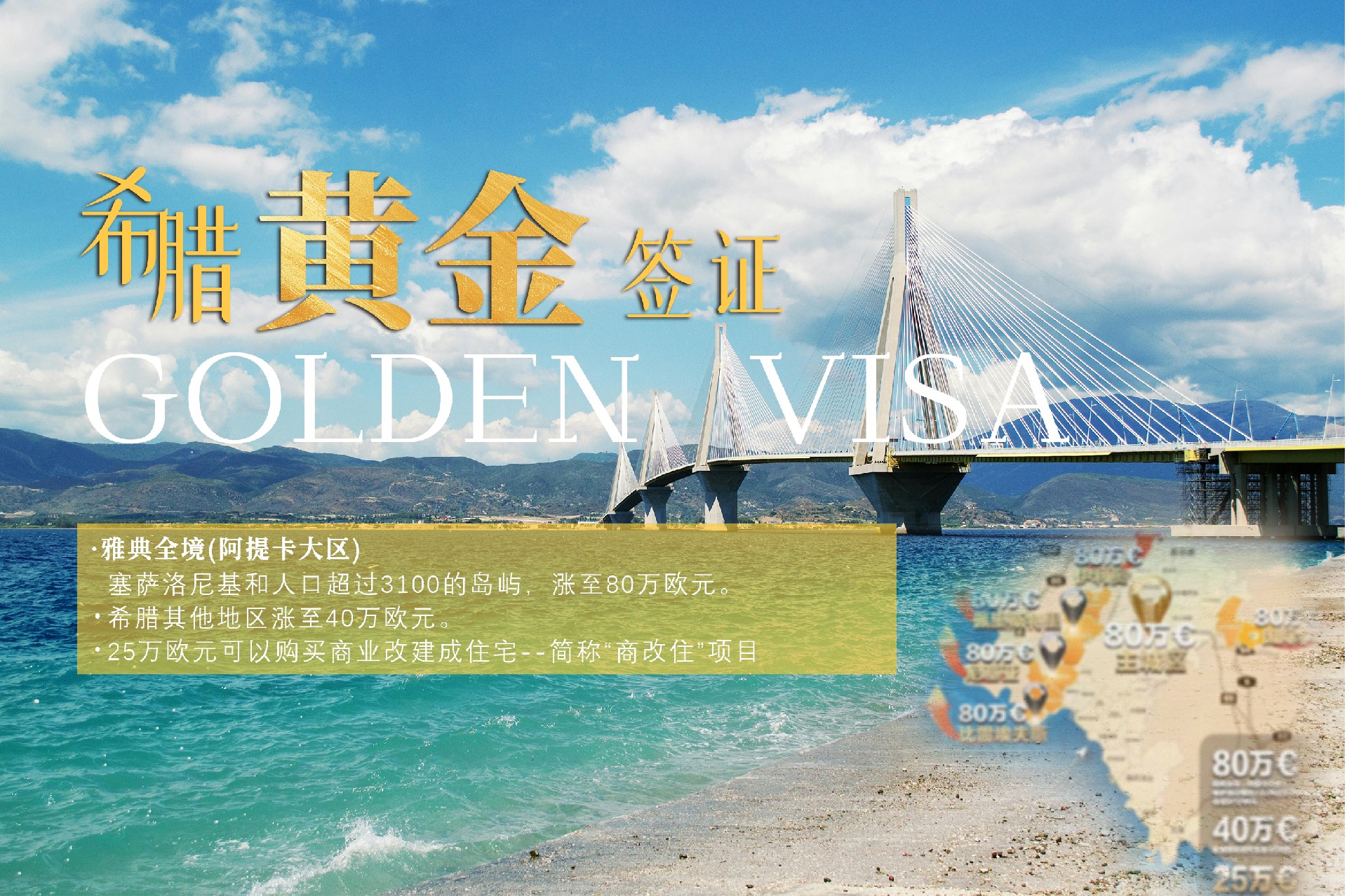 1.投资金额为80万欧元,适用于阿提卡大区和人数超过3100人的热门岛屿。购房要求为单套房产,且面积不少于120平方米。