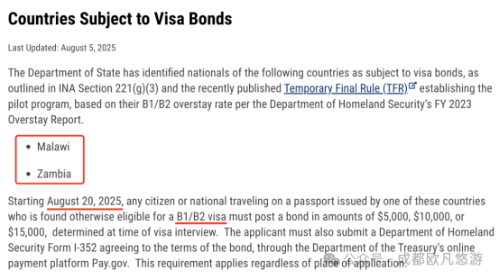 2025年8月5日,美国国务院在联邦公报发布正式通知,宣布自2025年8月20日起启动为期12个月的“签证保证金试点项目”。根据该计划,来自特定高风险国家的B1/B2(商务/旅游)签证申请人可能被要求缴纳5000至15000美元不等的保证金。目前首批确认的实施对象为非洲国家马拉维和赞比亚。申请人需在···